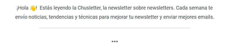 En el caso de mi newsletter de newsletters, la Chusletter, yo no tengo logo pero sí me gusta incluir una frase al inicio de todos los emails que envío. Aquí te dejo el ejemplo: