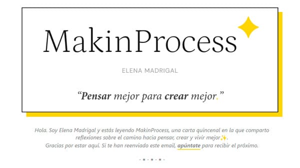 Aquí puedes ver el ejemplo de la cebecera de MakinProcess, la newsletter de Elena Madrigal. Observa cómo incluye el logo, su nombre, el claim «Pensar mejor para crear mejor» y a continuación una pequeña frase que resumen de qué va dicha newsletter.