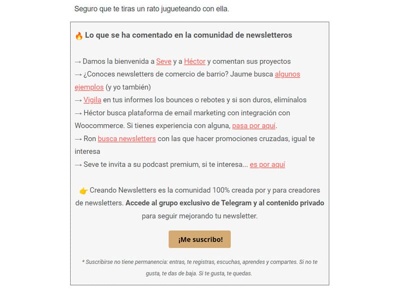 Mira el ejemplo de cómo utilizo yo un bloque destacado para resaltar los temas que hemos comentado dentro de Creando Newsletters, la comunidad premium de newsletteros.