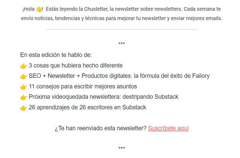 Lo sé. Pero me gustan las newsletters que dan cierto equilibrio visual bien sea añadiendo subtítulos para romper la monotonía y facilitar el escaneo del contenido.