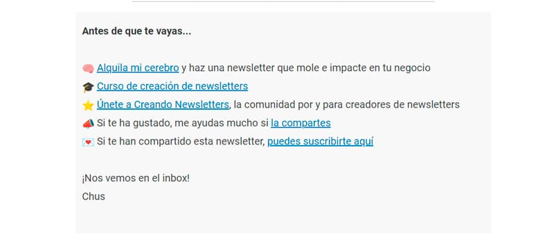 Si te fijas, al final del email aprovecho para enlazar con algunos servicios y productos que vendo. Esta es mi forma de monetizar la newsletter.